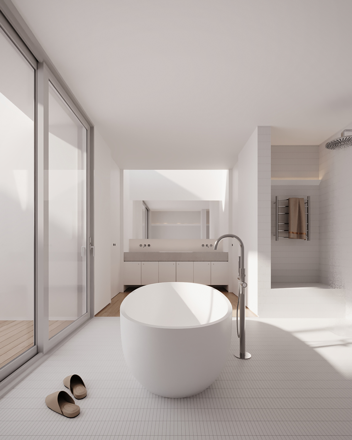 Materiais naturais, banheiras escultóricas, pedras em múltiplos acabamentos e metais com uso racional de água compõem uma atmosfera de pausa.