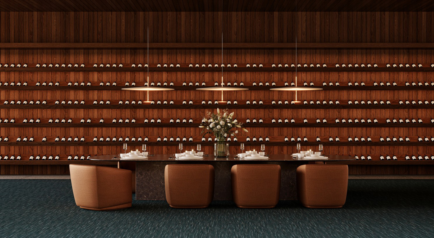 Superfícies foscas, texturas naturais, ranhuras que reproduzem madeira e pedra com fidelidade tátil. Iluminação, acústica e aroma passam a compor o projeto desde o início.